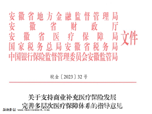 根據(jù)《中共中央、國務院關于深化醫(yī)療保障制度改革的意見》(中發(fā)〔2020〕5號)等文件精神,以“堅持有效銜接、堅持利民惠民”為基本原則,安徽省地方金融監(jiān)督管理局、安徽省財政廳、安徽省醫(yī)療保障局、國家稅務總局安徽省稅務局、國家金融監(jiān)督管理總局安徽監(jiān)管局于2023年5月23日聯(lián)合印發(fā)了《關于支持商業(yè)補充醫(yī)療保險發(fā)展完善多層次醫(yī)療保障體系的指導意見》(皖金〔2023〕32號)。由安徽省保險行業(yè)協(xié)會組織共保體遴選,最終確認中國人壽保險股份有限公司安徽省分公司、中國人民財產(chǎn)保險股份有限公司安徽省分公司、國元農(nóng)業(yè)保險股份有限公司安徽分公司、中國人民健康保險股份有限公司安徽分公司、中國太平洋人壽保險股份有限公司安徽分公司、太平養(yǎng)老保險股份有限公司安徽分公司、中國平安財產(chǎn)保險股份有限公司安徽分公司、中國太平洋財產(chǎn)保險股份有限公司安徽分公司、中國人壽財產(chǎn)保險股份有限公司安徽省分公司九家保險公司共同承辦安徽省商業(yè)補充醫(yī)療保險,由中國人壽保險股份有限公司安徽省分公司作為首席主承保公司牽頭負責項目協(xié)調(diào)、組織、實施等工作。