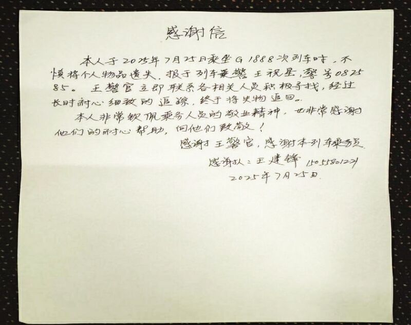 “本沒抱太大希望,沒想到這么快解決!”王先生難掩欣喜,連連稱贊王祝星辦事高效,手寫感謝信送至其手中,為這位年輕帥氣乘警點贊。