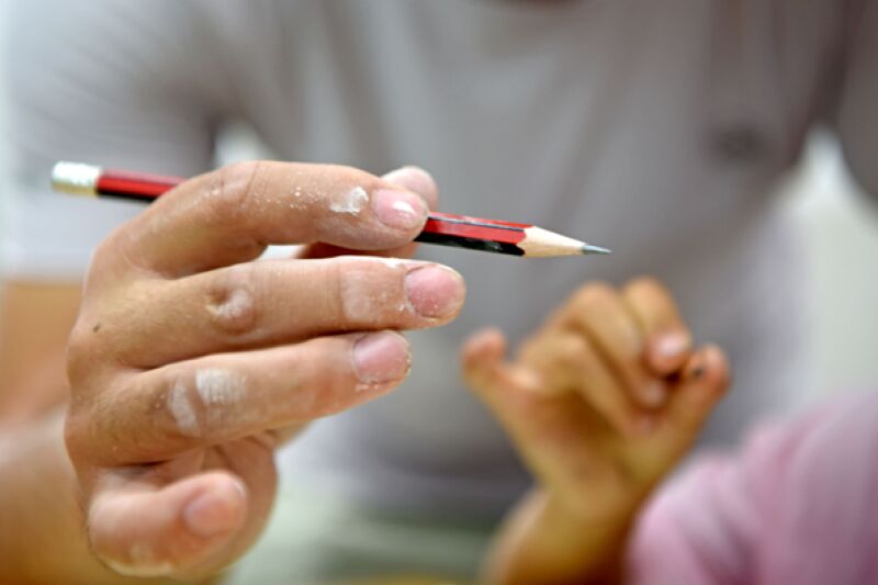 圖五:周勇指導一年級新生學習正確握筆方式。