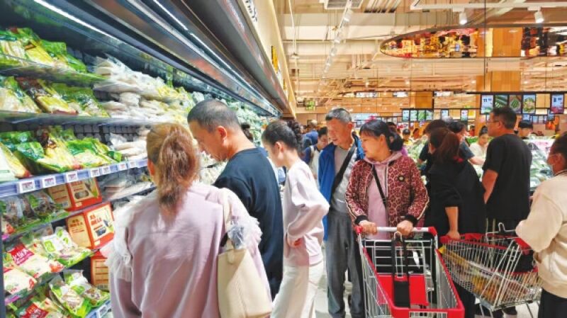 在市區一家大型購物中心,不少市民手提購物袋,滿載而歸。生鮮果蔬、特色食品、國潮文創等商品銷售紅火。餐飲街區同樣人氣十足,多家熱門餐廳出現排隊等位現象。