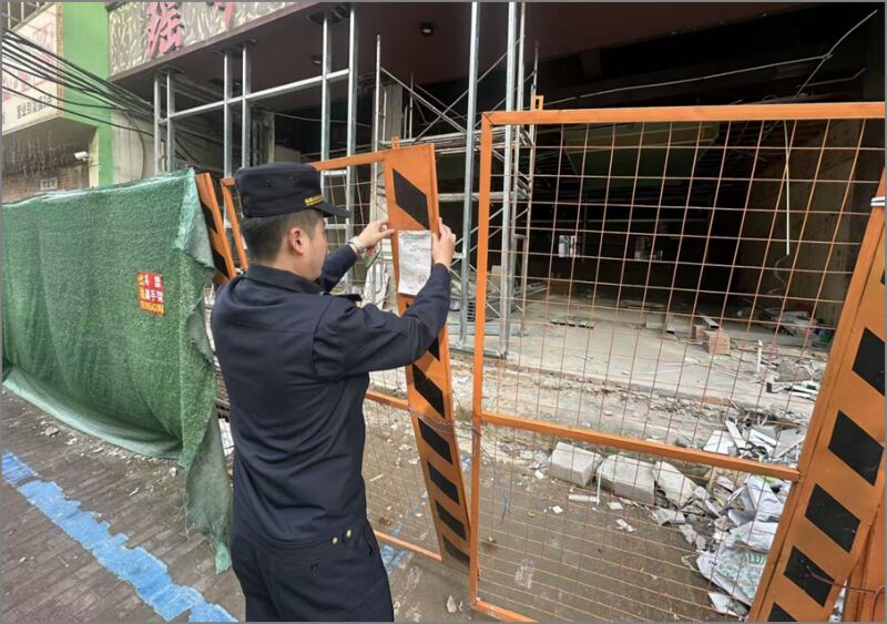 發現該情況后,執法人員立即現場制止施工,并向該店負責人現場宣講違建相關法律法規,明確指出其行為的違法性質及潛在安全風險。隨后,執法人員嚴格按照程序,現場完成證據固定,并依法下達責令整改通知書,要求其按期自行拆除、恢復原狀,否則將依法強制拆除。