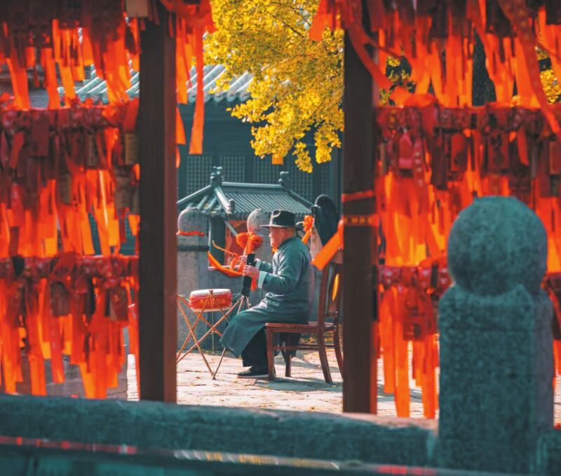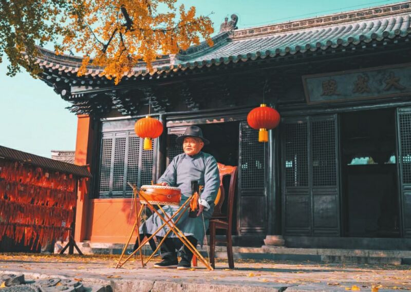 立冬的壽縣孔廟,千年銀杏通體鎏金,與古殿的飛檐斗拱相映如畫。大成殿前,壽州大鼓聲起,震徹云霄。柴現修先生一襲青衫,手持云板擊節,揮動重槌落鼓,開口如鐘鳴般唱起《趙匡胤困南唐》。鼓點密如急雨,唱腔蒼勁沉郁,仿佛將千年時光凝于一聲一韻之中。那銅聲鐵板之間,恍然已是千年流轉,多少悲歡傳奇,皆在這方寸舞臺間重現人間。