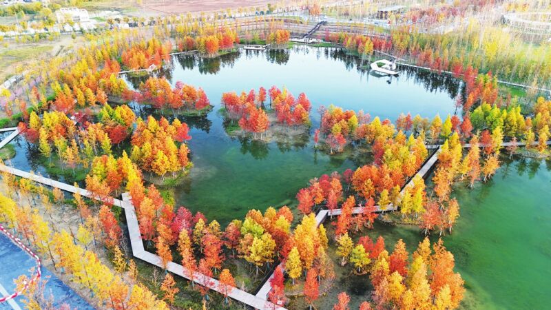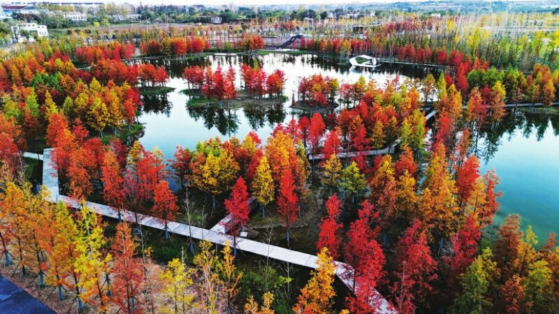 立冬時節(jié),淮南春申湖公園內水杉、烏桕等植物五彩斑斕,色彩旖旎,構成一幅精美的“油畫”。