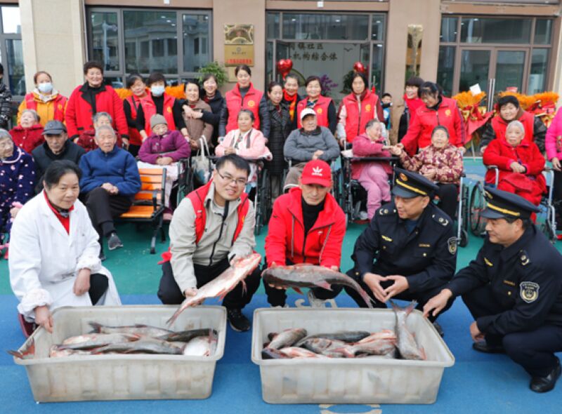 (記者 張雪峰 攝影報道)近日,大通區九龍崗鎮社區嵌入式養老服務機構綜合體的廣場上暖意融融;茨鲜袧O政執法大隊送來了200多斤新鮮漁獲物,為這里的老人們帶來了冬日的關懷與歡樂。正值義工聯志愿者在此開展愛心活動,現場歡聲笑語,老人們在志愿者的噓寒問暖中,感受到了物質與精神的雙重慰藉。