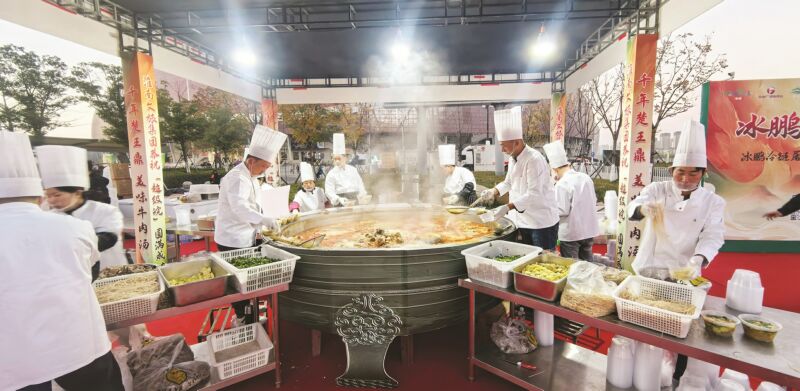 淮南主會場現場,以楚大鼎造型大鍋熬制的淮南牛肉湯可以滿足5000余名游客、市民共同免費品嘗。