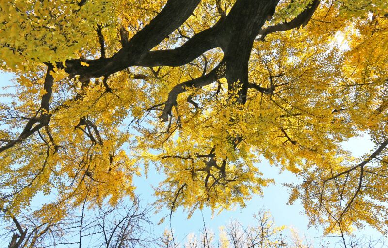 壽州古城報恩寺內的銀杏樹,據今已有1300多年歷史,歷經歲月滄桑依然枝繁葉茂。時入冬季,綠葉換上金黃外衣,微風拂過,葉片緩緩飄落,宛如一串串金色的詩行在空中搖曳,引得游客紛紛前來拍照打卡。