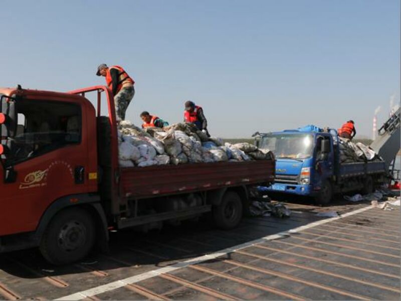 此次人工增殖放流活動為淮南港3號水上綜合服務區項目所開展的生態補償,活動地點位于平圩淮河大橋上游的原連崗碼頭處,該水域屬于淮王魚保護區實驗區。為確保安全,此次人工增殖放流活動租用了大型渡運船。因底棲生物貨源不同,渡運船先后從淮河北岸及南岸載運裝有底棲生物的貨運車,共計7輛,在船上安置穩妥。