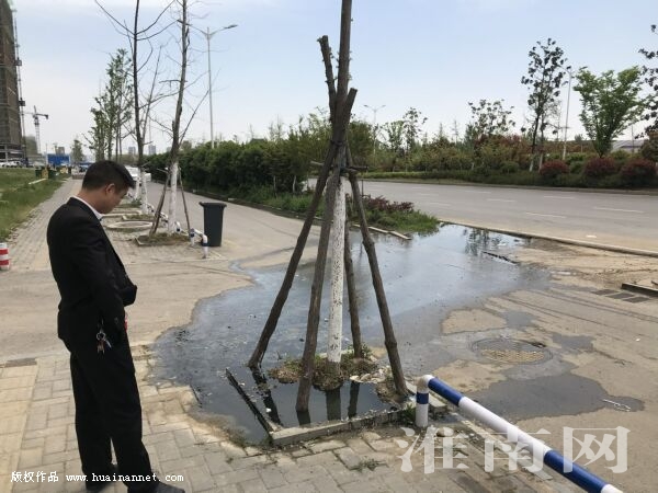 隨后,淮河早報、淮南網(wǎng)記者來到了安徽新地銳意物業(yè)服務有限公司淮南分公司英倫聯(lián)邦小區(qū)物業(yè)服務中心。該中心負責人與淮河早報、淮南網(wǎng)記者一起來到現(xiàn)場查看情況后,稱這處樹穴下確實埋著該小區(qū)的一條污水管道,但這條管道以前都是好好的,是挖樹穴導致管道破裂才出現(xiàn)的污水往外冒的情況,之前他們也向高新區(qū)管委會進行了反映。而且,就目前的情況來看,要想修好這條破損的管道,防止污水再次往外冒,必須移樹、破路,把管道扒開才行,對此他們物業(yè)實在沒有辦法,只能向有關(guān)部門反映。
