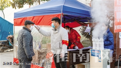 “社區(qū)吹哨、黨員報到”活動開展以來,潘集區(qū)田集街道160余名在職黨員紛紛響應(yīng),迅速走進23個社區(qū)協(xié)助開展疫情防控工作。圖為黨員志愿者為出入小區(qū)的居民測量體溫。(通訊員 劉群)