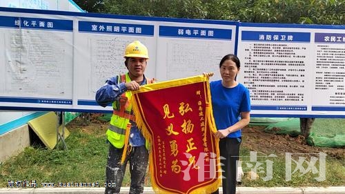 (記者 鄭潔 攝影報(bào)道)“真的太感謝你了,要是沒(méi)有你奮不顧身、見(jiàn)義勇為,及時(shí)沖進(jìn)廚房關(guān)閉燃?xì)忾y門,后果真的想都不敢想!”9月27日上午,在東苑東區(qū)的淮南建工建筑工程有限公司工地上,該小區(qū)57號(hào)樓業(yè)主孔娜娜送來(lái)一面錦旗,向員工程阿超表達(dá)她的感激之情。