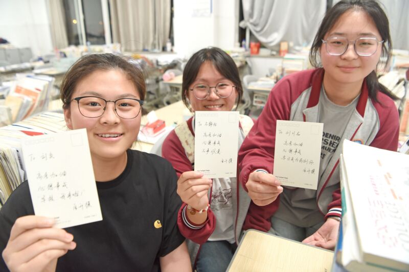 又是一年高考季,我市用心用情用力做好考試組織和考生服務工作,全力以赴實現“平安高考”目標任務。圖為6月3日,淮南二中高三學生展示老師贈送的高考祝福卡片。