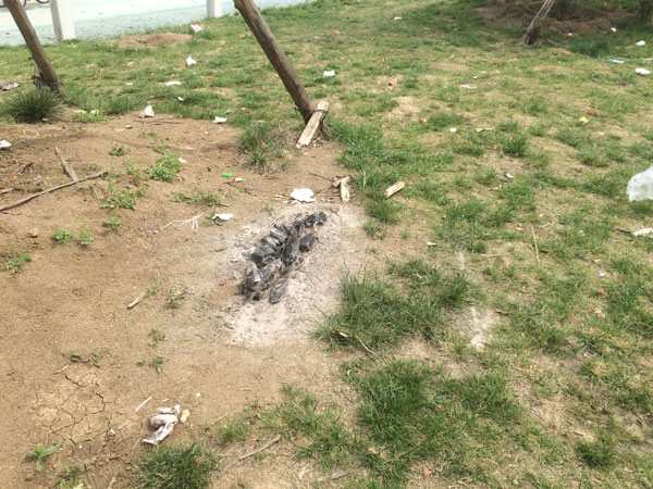 除了這些成品的包裝盒、包裝袋以外,在山南中央公園里還有燒烤遺留下的物品。在靠近沙灘的草地上,淮河早報、淮南網(wǎng)記者看到多處草地上散落著竹簽、酒瓶和碎骨頭等,明顯是燒烤后留下的,而在一棵樹旁還有遺留下沒有燒完的木炭,周圍的草地已經(jīng)是光禿禿的了。在這片草地上,淮河早報、淮南網(wǎng)記者大概地數(shù)了數(shù),有近10處燒烤點。