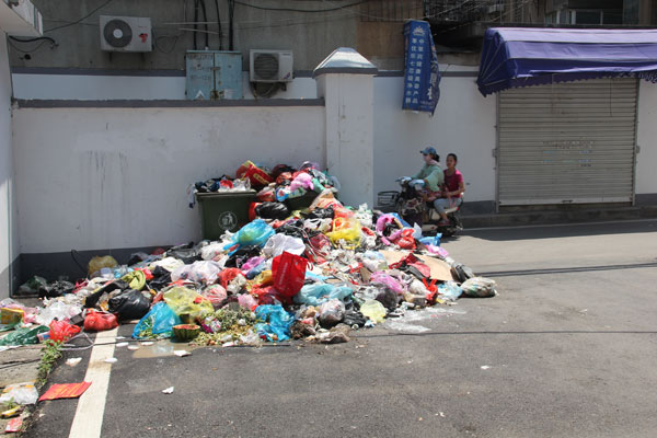 圖:團結巷農行家屬樓前堆放的垃圾(攝于6月16日上午11時)