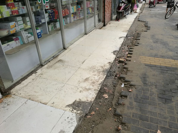 接到反映后,淮河早報、淮南網記者隨后到洞山小街看到,洞山小街道路改造維修已接近尾聲,施工人員正在完善路面設施。在韓女士的藥店門前,由于地勢南高北低,店門口有兩個階梯型瓷磚地面,而店前新鋪設的路面也順著地勢鋪開,有的與店門口齊平,有的稍稍高出,在路面與店面直接留有空地,沒有磚塊。韓女士介紹,路面未改造前是明顯低于店面的,不存在雨水流進店里的情況,但路面改造過后,原來的路面墊高了,與店前地面基本上一樣高了,有的還高于店前地面,很容易出現雨水流進店里的情況,找施工單位至今也未解決。韓女士介紹,之前雨水流進店里后,她就將店前鋪設的一些地磚拆掉了,之后才沒有出現雨水流進店里的情況。