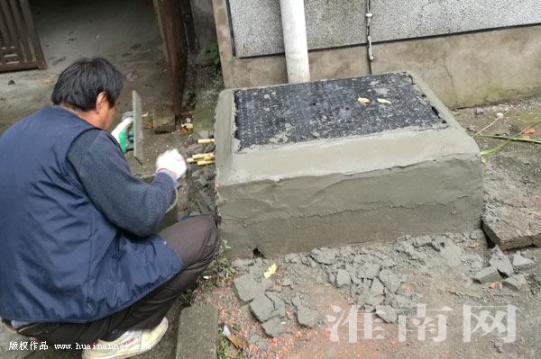 11月22日,在華聲苑小區,淮河早報、淮南網記者看到,在居民樓外的地面上,砌好了一個個長方形狀的池子,施工人員將原來安裝在樓道內的水表遷移至池子里,覆蓋上珍珠巖,并蓋上蓋子。
