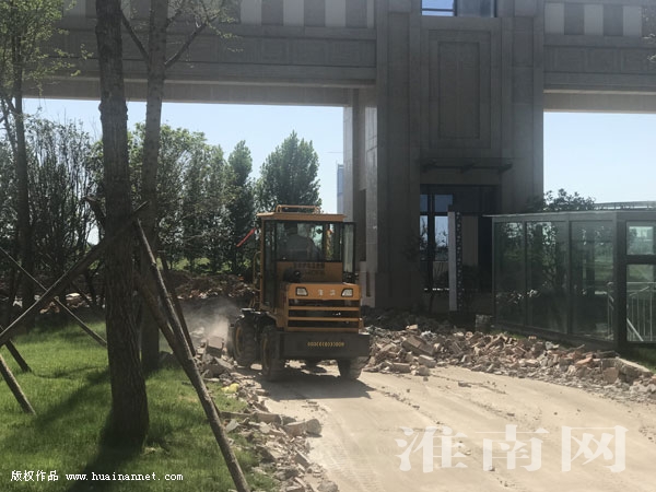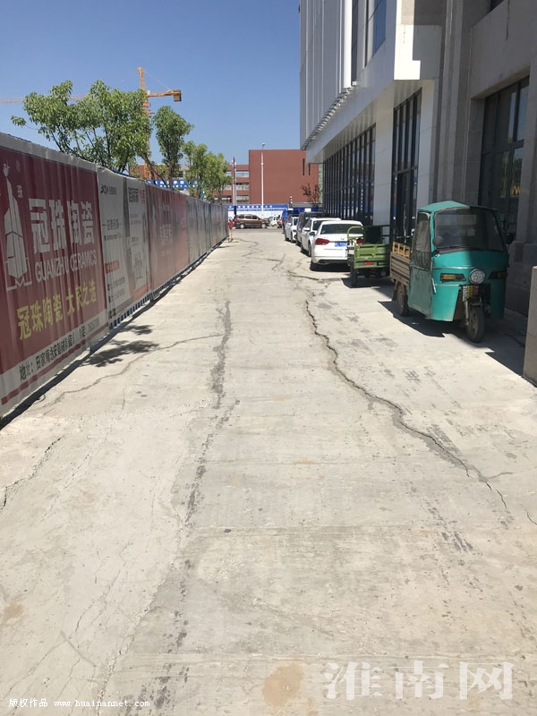 接電后,淮河早報、淮南網記者于6月7日來到鉆石星座小區。到達鉆石星座小區后發現,該小區唯一進出道路緊靠一施工工地,道路沉陷較為嚴重,路面開裂破損較多,類似于臨時道路,根本不像新建小區道路。進入小區后看到,該小區面積不大,只有六棟樓房,小區內道路已經修好,為瀝青路面。六棟樓房之間的中心地帶綠化已經完工。而在小區西門大門口則堆放了大量的建筑垃圾,一臺小型推土機正在清運垃圾,西門外是大面積荒地。小區南側和北側則是正在施工的工地,工地上黃土完全裸露沒有使用防塵網覆蓋,揚塵問題十分突出。小區內地下車庫尚未使用,由于小區內面積不大,業主車輛無法停放,只能把車輛停放在小區外的道路邊。