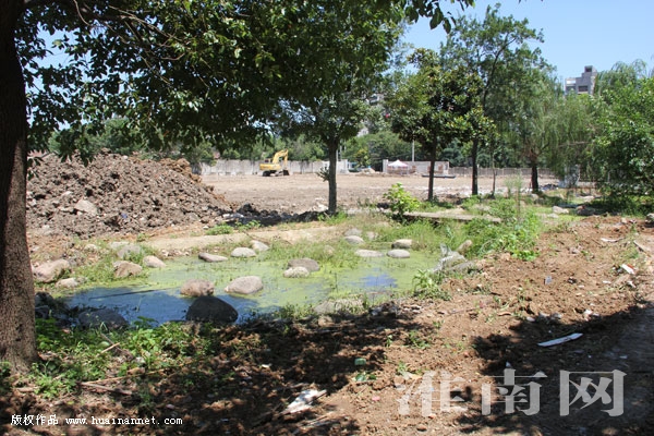 7月12日上午10時(shí)許,淮河早報(bào)、淮南網(wǎng)記者來(lái)到了桃源居小區(qū),在居民的指引下,通過(guò)小區(qū)西邊圍墻的一扇小門走進(jìn)了這處“景觀綠地”。然而,整片綠地確如居民反映已被推成了一片廢墟,還殘留了木制棧道和幾條彎曲小道的痕跡;棧道的附近原本有一處池塘,雖然圍墻外已被破壞得看不出原貌,但圍墻內(nèi)的人造池塘仍然保存完好,不難想象這處綠地先前的美麗景象。